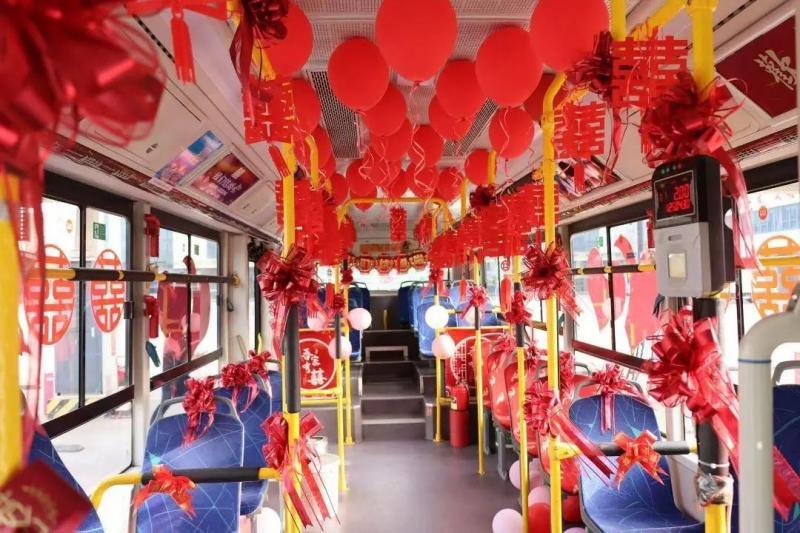 為滿足市民公交婚車個性化服務需求,公司以“個性元素設計+點對點運行”的多重專屬服務模式,將公交婚車裝扮成流動的“愛情紀念冊”,推出了常規(guī)公交車、寶寶巴士等多種車型供新人選擇,并提供迎親、賓客接送等全鏈條服務。公交婚車內飾以彩帶、囍字掛飾營造浪漫氛圍,讓每一寸空間都盛滿愛意,“點對點”路線規(guī)劃串聯(lián)起家與幸福的彼岸,行程安全順暢,親友團全程共乘一輛車,在溫馨互動中共同見證愛情足跡,承載著歡聲笑語奔赴幸福旅程。