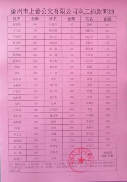 涓涓細(xì)流匯成愛(ài)與勇氣的海洋,不同數(shù)額的款項(xiàng)不斷匯入的背后,凝聚的是廣大職工對(duì)奮戰(zhàn)在一線的醫(yī)務(wù)人員和其他城市抗擊疫情人員的愛(ài)心與支持,在抗擊疫情的攻堅(jiān)時(shí)刻,上善公交人奉獻(xiàn)愛(ài)心,責(zé)無(wú)旁貸,以自己的實(shí)際行動(dòng),盡綿薄之力積極助力疫情防控,為全面打贏這場(chǎng)沒(méi)有硝煙的硬仗貢獻(xiàn)力量。