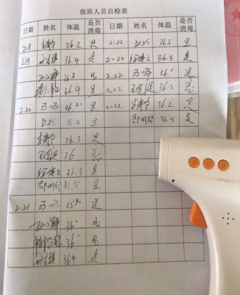 值班人員每天測量體溫做好體溫監(jiān)測記錄。