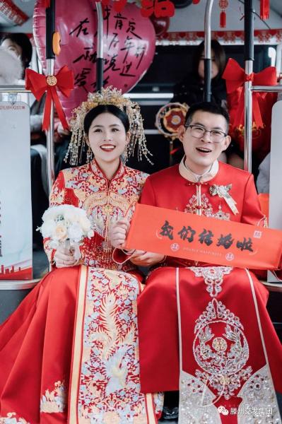 車頂燈顯示著帶有新人名字的專屬婚車字樣,車窗貼著囍字,內(nèi)飾五彩繽紛、大紅的喜字和氣球等掛件懸掛在整個車廂,橫幅“我們結(jié)婚啦”占據(jù)車廂的“C位”, 經(jīng)過一番裝扮,迎親公交散發(fā)出喜慶氛圍。象征美好愛情的公交婚車,行駛在市內(nèi)的街道上,儼然一道亮麗的風(fēng)景。