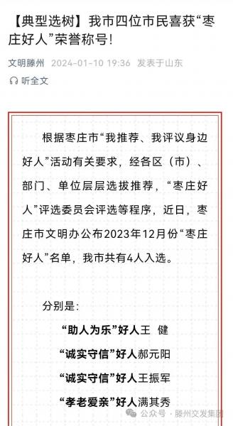 近日,棗莊市文明辦公布了2023年12月份“棗莊好人”名單,滕州市共有4人入選,其中,交發(fā)集團(tuán)道服公司郝元陽(yáng)喜獲“誠(chéng)實(shí)守信”好人榮譽(yù)稱號(hào)。
