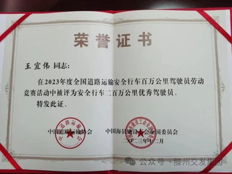 近日,在2023年度全國道路運輸安全行車百萬公里駕駛員勞動競賽活動中,我省共有9名駕駛員獲得“全國道路運輸安全行車二百萬公里優(yōu)秀駕駛員”榮譽稱號,其中滕州市交通發(fā)展集團(tuán)國運公司駕駛員王宜偉也獲此殊榮。