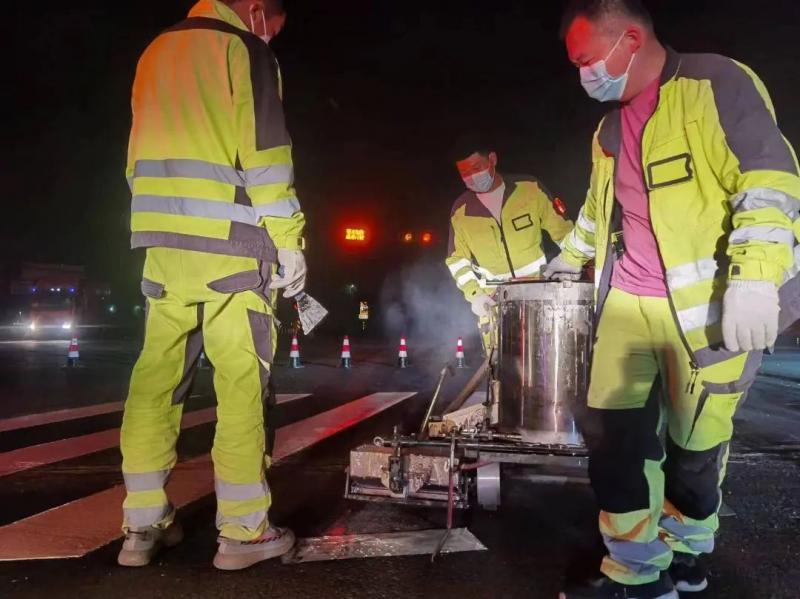 為確保白天道路交通秩序,公司施工隊(duì)伍將標(biāo)線施工安排在夜間進(jìn)行。在交通晚高峰過(guò)后,路上車流相對(duì)減少的情況下,施工人員便開(kāi)始忙碌起來(lái),設(shè)置好施工標(biāo)志和警示標(biāo)志,清除施工區(qū)域的障礙物,按照預(yù)定的劃線方案,使用專業(yè)的道路劃線機(jī)械和人工輔助進(jìn)行施工,經(jīng)過(guò)連日持續(xù)夜間奮戰(zhàn),高效完成了施工任務(wù)。