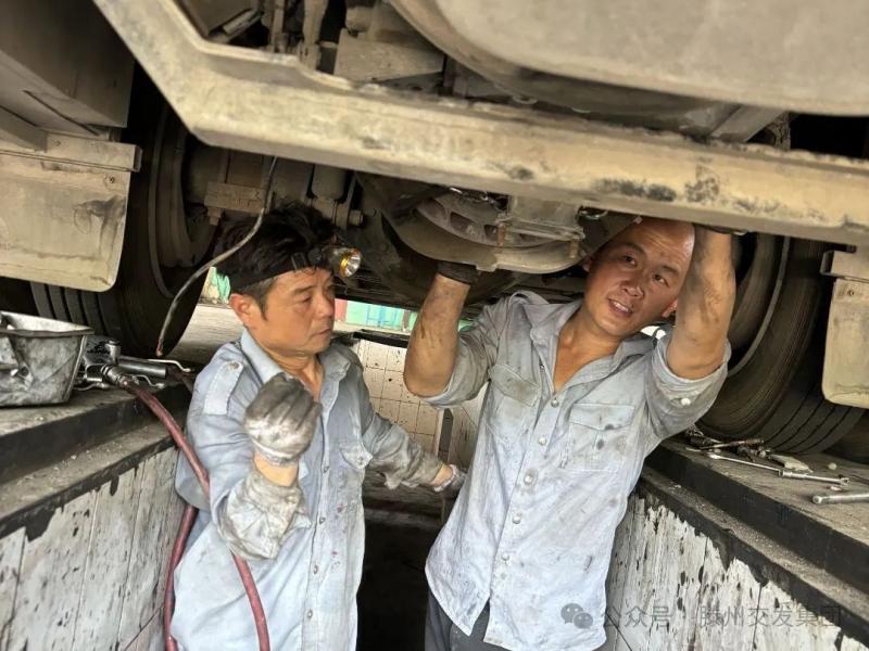 在維修車間,檢車員認(rèn)真檢查每一部車輛部件,特別是車輛的空調(diào)系統(tǒng)、電瓶、剎車、制冷等系統(tǒng),燈光、雨刮器等部位,他們的衣服濕了又干、干了又濕,依舊嚴(yán)守工作標(biāo)準(zhǔn),精檢細(xì)修,確保發(fā)車前車輛技術(shù)狀況完好。